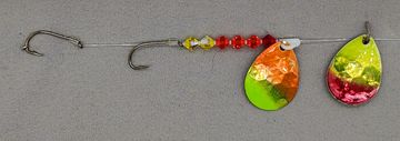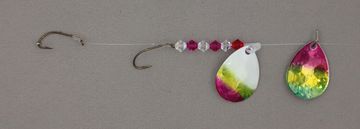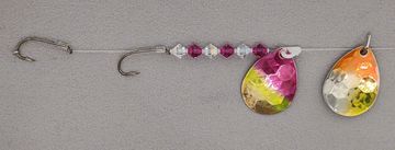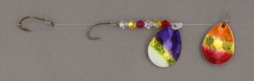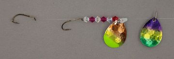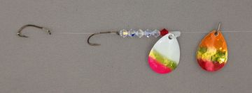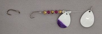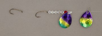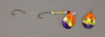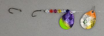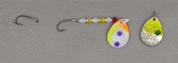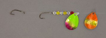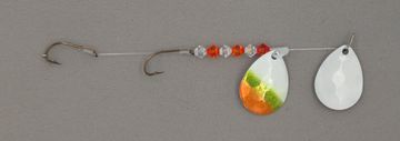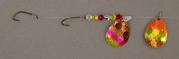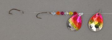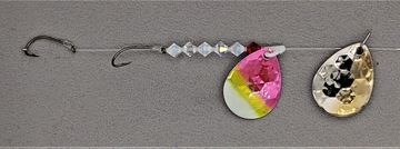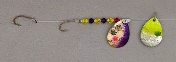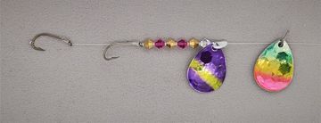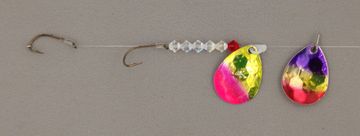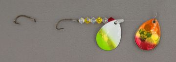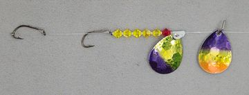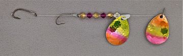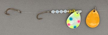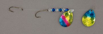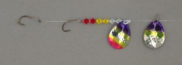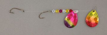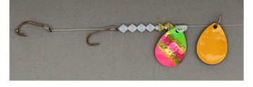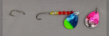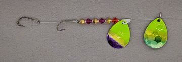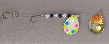 All Reel Rumors Harnesses are built with glass crystal beads, 60 inch 20 lb. leader, two #4 bait holder single hooks and a custom powder coated #4 Colorado blade with quick change clevis.
